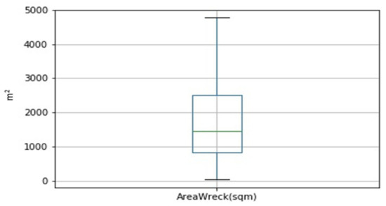 Box and whisker plot showing wreck area in square meters (four extreme outliers have been removed to avoid skewing of data).