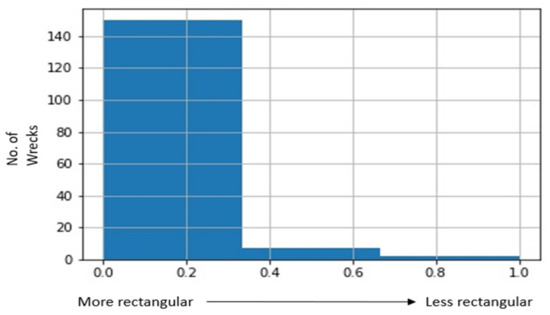 Histogram showing wreck rectangularity where rectangularity is on the x-axis (0 is perfect rectangle, larger numbers are less rectangular) and count is on the y-axis (four extreme outliers have been removed to avoid skewing of data).