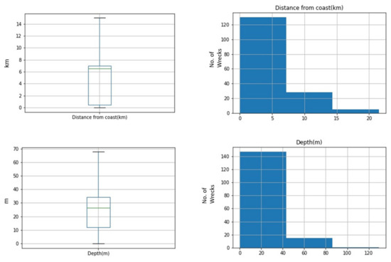 Box and whisker plot and histograms showing wreck distance from coast in kilometers and wreck depth in meters.