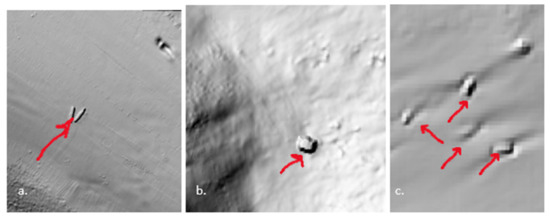 Less obvious shipwrecks with arrows above were more common than the type shown in Figure 9. These shipwrecks in (a,b) occur off the coast of Washington and in (c) off the coast of Connecticut/New York, at a water depth of 29 (a), 60 (b), and 45 (c) m, respectively.