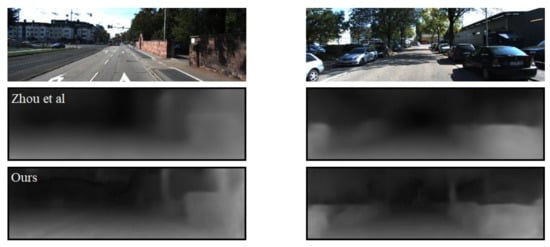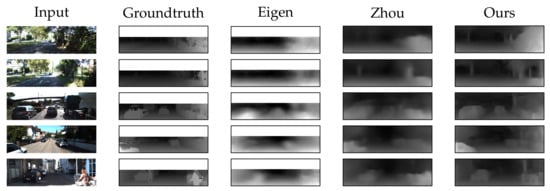 To demonstrate the superiority of our method, we compared it with some classical methods, including supervised methods [13,20] and unsupervised methods [4,5]. The ground-truth depth was from LIDAR data, which were obtained by projecting the point cloud to the image plane.