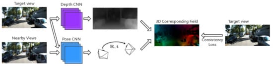 At the same time, researchers have also explored the ability of deep learning methods to estimate the ego-motion among views. Ref. [30] proposed a method for estimating ego-motion from video images by training neural networks through LIDAR data. In their method, the LIDAR provides the depth information of the scene, thus the ego-motion can be easily guaranteed, but the LIDAR data are not easy to obtain compared to the image data. By combining the CNN network and the RNN network, Ref. [31] fused video sequence and inertial sensor (IMU) data to estimate the ego-motion. However, their work did not consider depth information of the scene.