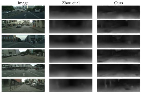 Table 5 compares the results of our work with existing work in estimating the depth of the scene. As seen in Table 5, “Ours” and “Ours consis” indicate the results of using and not using the consistency constraints, respectively. Experimental results showed that our method was significantly better than supervised learning methods, which showed that our method overcame the impact of the supervised learning method on the results due to the poor quality of the supervised data. Compared with the benchmark work [5], our results reduced the average error from 0.208 to 0.169, which reflected the effectiveness of our method. Our results still had some gaps with the results of the stat-of-the-art method of 0.148 by Godard [15] since their method used images with known camera baseline as supervised data, we believe that the gap is due to our method not further constraining the ego-motion. In addition, the consistency loss further narrowed the error from 0.176 to 0.169, which reflected the effect of our loss term. Figure 6 is a qualitative comparison of visualizations. The experimental results reflected the ability of our method to understand 3D scenes, that is, the method successfully analyzed the 3D consistency of different scenes.
