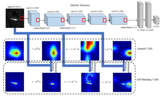 Although the aforementioned CNN-based methods can achieve high recognition performance and calculation efficiency, a CNN is usually used as a “black box” whose innate recognition mechanism still lacks analytical or mathematical explanation [,]. In this case, the reliability of recognition results is less convincing than traditional target recognition methods, which is sometimes fatal and unacceptable, particularly in some special scenarios [,]. To obtain a better explanation of a CNN’s mechanism, a number of methods have been proposed to visualize the internal representations learned by CNNs in the recent half-decade [,,,,,]. These methods are developed to highlight the regions of an image that are responsible for CNN decisions, which can be further divided into three categories: perturbation-based, propagation-based, and class activation mapping (CAM) methods. Perturbation-based methods occlude some patches of an image with black squares and detect whether there is an obvious drop of class score, then a heatmap can be produced according to the change of class score. Propagation-based methods are faster. They use gradients to visualize relevant regions for a given class, whereas the generated heatmaps are usually noisy. In contrast, CAM methods visualize CNN decisions using feature maps of deep layers, which can provide a mathematically explicable heatmap with some extent. In this paper, a CAM method is adopted as the visualization tool rather than perturbation algorithms and propagation algorithms due to the following. (1) CAM correlates the feature maps in a CNN’s hidden layer with heatmap generation while perturbation algorithms only occlude or conserve some patches in input images. (2) Although propagation algorithms can avoid gradient calculation to run faster, they are difficult to be applied to CNNs since a rather complicated correspondence exists between weights and elements in feature maps of a certain convolutional layer. Recently, increasing attention has been drawn to CAM, and numerous novel CAM methods have been proposed, such as Grad-CAM [], Grad-CAM++ [], XGrad-CAM [], Ablation-CAM [], Score-CAM [], etc. However, these CAM methods show restrained effects on SAR image target recognition tasks because the SAR images are different from ordinary optical images including imaging mechanisms and wavelength range. In this paper, a Self-Matching CAM is proposed to highlight a more precise region of the target for classification than the above CAM methods. Numerous experimental results are conducted on a benchmark dataset (MSTAR) to verify the validity of the Self-Matching CAM.
