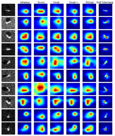 Figure 3 shows 10 SAR images of different targets and their corresponding heatmaps generated by Ablation-CAM, Score-CAM, Grad-CAM, Grad-CAM++, XGrad-CAM, and Self-Matching CAM. Qualitatively, it is intuitively evident that Self-Matching CAM outperforms other CAM methods dramatically. Only Self-Matching CAM can delineate the sophisticated edge of the target, while the other CAM methods can only provide a rough region. Score-CAM, Grad-CAM, and XGrad-CAM usually highlight a region that excessively covers the target, while Ablation-CAM and Grad-CAM++ highlight a narrow region that covers the target incompletely.