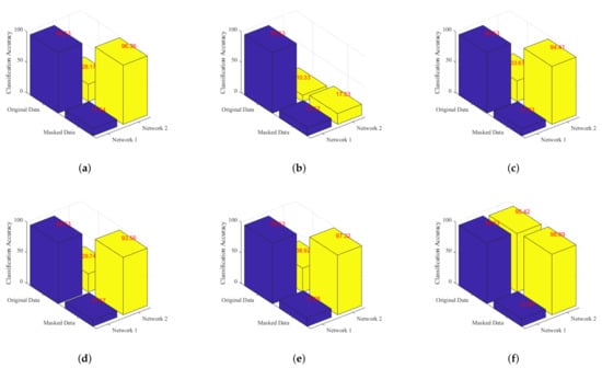 Comparison of classification accuracy for Network 1 trained with original data and Network 2 trained with masked data. (a) Ablation-CAM. (b) Score-CAM. (c) Grad-CAM. (d) Grad-CAM++. (e) XGrad-CAM. (f) Self-Matching CAM.