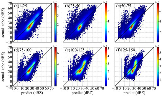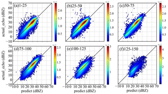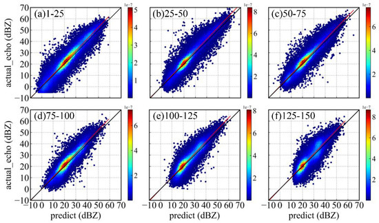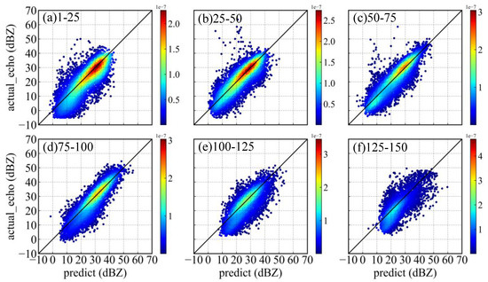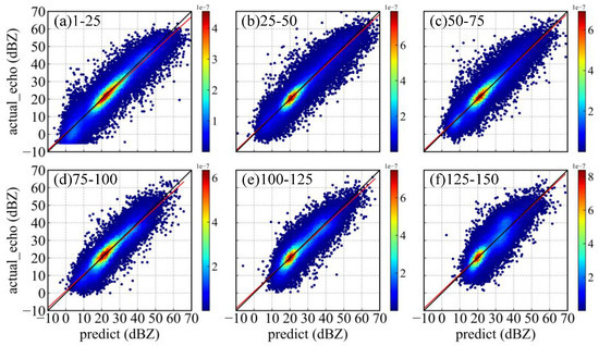 Figure 5 shows the six scatter plots of actual and predicted echo reflectivity with the test dataset of each section, where the loss function of MSE is used in the training process. The red line is a linear trend line of scattered points. The color mark represents the Gaussian kernel density estimation of the scatter point (Equations (10) and (11)). The larger the value is, the denser the scatter point.