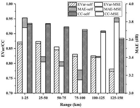 In Table 5, the EVars are all above 0.92 except for the models of the first range section from 1 to 25 km, the MAEs are less than 4.5 dB, and the CCs are greater than 0.96 except for the first section, which further verifies the effectiveness and stability of the deep learning algorithm applied to the echo correction. Comparing the values of the model evaluation indicator compiled with the self-defined loss function and MSE in Table 5, the average value of MAE decreases 0.1085 and EVar and CC increase 0.0023 and 0.0017, respectively, which suggests that the models with the self-defined loss function perform better.