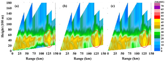 In order to further verify the performance in strong echo area with the self-defined loss function, three radial profiles at the unblocked azimuth 48° in Figure 13 are plotted in Figure 14. As shown in the red ellipse area in the 0.5° elevation, comparing with the raw data (a), the strong echoes with the self-defined loss function (c) are more consistent than that with the MSE (b), which demonstrate that the model with the self-defined loss function is better than that with the MSE for fitting strong echoes.