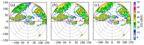 As shown in Figure 13, the shapes of the strong echo marked with the blue ellipse are basically consistent among the three PPIs, and the consistency between Figure 13a,c is better, which further illustrates that the self-defined loss function performs better on strong echo fitting. The points number of strong echo (>40 dBZ) in Figure 11 are counted. There are 1807 points (3.37%) in the actual PPI (Figure 13a), 1740 points (3.24%) in the PPI predicted with the MSE loss function model (Figure 13b) and 1841 points (3.43%) with the self-defined loss function model (Figure 13c), and the proportion of strong echo with the self-defined loss function is closer to that of raw observation.