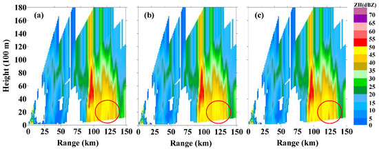 In order to demonstrate the filling effect more clearly, three radial profiles at the blocked azimuth 215° in Figure 9 are shown in Figure 10, in which image (a) is the raw data and (b) and (c) are the corrected data with the MSE and the self-defined loss function, respectively. Both the models can correct the 0.5° occlusion well and make the vertical structure of cloud more complete. In the strong echoes area (red ellipse area), the filling echoes with the self-defined loss function are stronger than that with the MSE, which realizes the purpose of highlighting the strong echo.