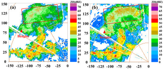 The weak echoes area in Figure 13 observed with the Nanjing radar (a) and interpolated with the Bengbu radar (b), where the red triangle is the location of the Bengbu radar.