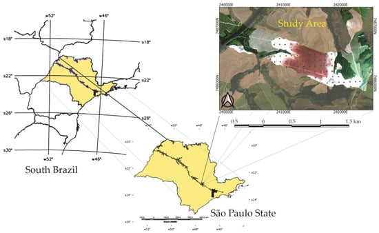A total of 66 soil samples (0–20 cm depth–Figure 2) was uniformly distributed over the area and collected in July 2017. The soil samples were analyzed for particle size by the pipette method and wet sieving using 0.1 mol L−1 NaOH as a dispersing agent. Soil organic matter was obtained by determining the organic carbon content (Walkley-Black method) and subsequent multiplication by the 1.724 factor according to Teixeira et al. [34]. The descriptive analysis was carried out with the STATISTICA v. 12 software (StatSoft, Tulsa, OK, USA).
