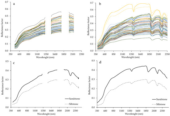Spectral curves of soil samples. Curves of the 66 samples obtained by the AisaFENIX Sensor (a) and ASD FieldSpec 3 JR Sensor (b); average of spectral data from sandstone and siltstone obtained by the AisaFENIX Sensor (c) and ASD FieldSpec 3 JR Sensor (d). The gap in the curves of the AisaFENIX sensor is due to the absorption of EMR by the atmosphere.