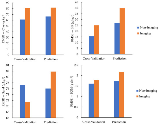 Furthermore, highly significant positive correlations were observed among the estimated contents of clay (0.858), sand (0.849), and SOM (0.897) by the PLSR models for the imaging and non-imaging sensors.