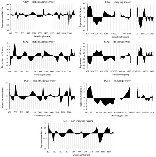 By PLSR definition, all wavelengths participate, in different proportions or weights, in the construction of the model. In this regard, Figure 6 illustrates the regression coefficients for PLSR models of clay, silt, sand and SOM for both sensors, which are considered important to the prediction of these attributes through its determination coefficients (R²).