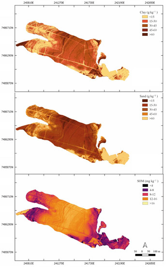 The mathematical model generated by PLSR in the calibration step for clay, sand and SOM were applied to all pixels from the image. The result was a quantification map for each pixel, divided into classes for better representation and visualization. As the soil attributes presented a strong correlation with the image sensor data (Table 4), it was possible to quantify the estimates of interest. Similarly, Pullanagari et al. [85], mapped nutrients in pasture using classification algorithms.