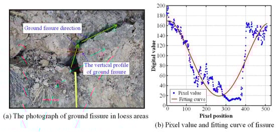 (a) Photograph and (b) pixel value distribution (red line shows the fitting curve) of ground fissures in loess areas.
