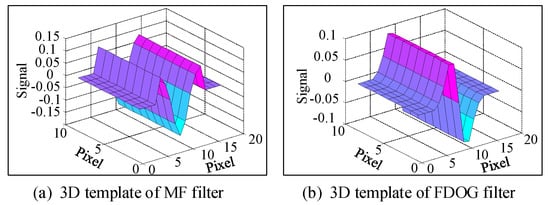 where all parameters are the same as those in Equation (1). Figure 2a,b show examples of the three-dimensional diagram about the MF template and FDOG template, respectively. The parameters of both templates are set to = 1.5, = 9.0, and = 90° (i.e., the template is along the vertical direction).