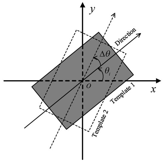 The orientation and distribution of ground fissures are arbitrary. Thus, we must process images with the optimal direction number of templates to ensure that all ground fissures are detected. In experiments, the template direction number will have a strong effect on the sensitivity and accuracy of the modified MF-FDOG algorithm; however, ground fissures are a linear target, which means that they can be regarded as a straight line with an anti-parallel characteristic in a local area []. Therefore, we only need to create a template with directions of 0°–180° in two-dimensional space. To create these templates with different directions, the central pixel of the templates is set as the origin (0, 0) of the coordinate system. We must decide how many directions, N, we want in the 180° space. Then, the angular interval of direction is calculated using Equation (4). The rotation angle, , between the direction of the template and the x axis (see Figure 3) and the rotation matrix are represented by Equations (5) and (6), respectively:
