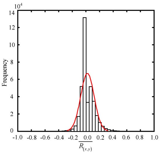 Figure 4 is the frequency histogram of the matrix, which exhibits a Gaussian distribution. Generally, ground fissures are small targets in UAV images, whose area is far less than that of the loess, vegetation, and other ground targets. Ground fissure signals show a strong response after the modified MF-FDOG convolution operation. It is reasonable to choose a threshold T, according to the mean and standard deviation of to segment the image using (11) and (12). Then, pixels with values greater than T can be considered ground fissure locations. Finally, ground fissure candidates can be extracted from the images; i.e., locations with :
