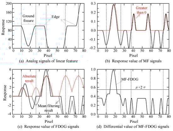 Analog signals of ground fissures and edges (modified from Stumpf et al. 2013): (a) analog signals of linear features; (b) response value of MF signals; (c) response value of FDOG signals; and (d) differential value of MF-FDOG signals.