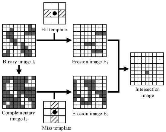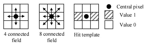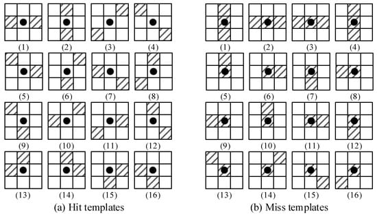 It is noted that the length of the used template is typically odd; thus, the central pixel can be chosen as the target pixel. However, a non-central pixel can also be chosen as the target pixel. In some special cases, the length of the template can be set as even. Moreover, it is unnecessary that the “hit” template and “miss” template are completely complementary for each pixel when they are built (see Figure 7a,b), provided that the pixels set to one do not overlap each other.