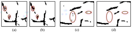 Among the ground fissure candidate sets, there are some discrete pixels (or small sets of pixels), whose area is far less than the area of the ground fissure. To improve the results, these small patches must be removed. After connecting the disconnected ground fissure sections, these patches should be deleted if they contain three or fewer pixels that satisfy the relationship of the eight-connected field in the range of 3 × 3 (Figure 9c,d).
