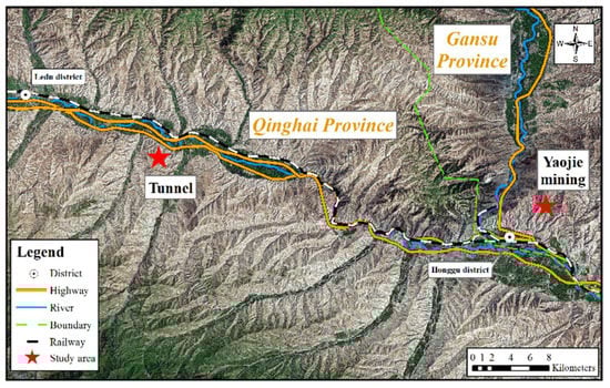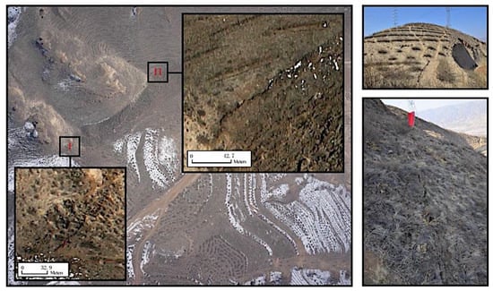 A mountain over a tunnel in Qinghai province and a mining area in Gansu province were selected as the study areas to represent typical developing loess landforms (red five-pointed stars in Figure 10). Due to the instability of loess units, as well as other natural and anthropogenic factors, ground fissures are a very common geological phenomenon. These two areas predominantly comprise very complex mountainous terrain. The exposed loess surface is unstable because of its typical semi-arid climate and small forest coverage. To prevent soil erosion, the local inhabitants have planted banded vegetation and trees on the mountain.