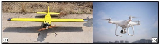 Equipment used for image acquisition ((a) is a homemade UAV that comes from the Third Aerial Survey and Remote Sensing Institute of the Ministry of Natural Resources; (b) is Phantom 4 Pro comes from SZ DJI Technology Co., Ltd.).