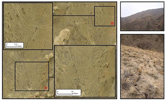 For the tunnel area (Figure 12), the coverage of the image was 5 km × 2 km, with an elevation of 1930–2500 m. According to the field investigation, there are a large number of ground fissures, loess craters, remaining snow, and withered grasses in the mountain areas. The maximum width of ground fissures is no more than 30 cm: however, the depth is up to 120 cm. Some ground fissures are covered by broken soil after a period of weathering and snow melting. The coverage of the mining area (Figure 13), which is less than that of the tunnel area, is predominantly composed of bare soil, withered grass, ground fissures, and artificial structures. As shown in Table 1, the flight altitude of PHANTOM4 is approximately 150 m. Therefore, we can obtain high-resolution images in which the ground fissures can be clearly recognized.