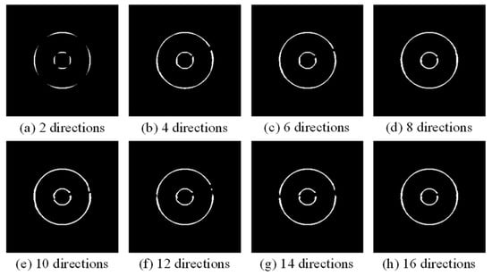 To determine the relationship between the accuracy of the modified MF-FDOG algorithm and the direction number of the template, we designed a specific experiment, which can provide important insights into selecting the template direction number. Firstly, only one group of templates is used to extract ground fissures with different widths from the UAV image. To determine whether the template has the same directionality characteristics as the ground fissures of different width, it is necessary to simulate two ground fissures with different widths covering the full direction of 360° (Figure 14). The length and width of the simulated images are 295 pixels. Secondly, we created eight groups of templates with different direction numbers, which have the same values of parameters and L. Finally, the modified MF-FDOG convolution operation results are shown in Figure 15 and Figure 16.