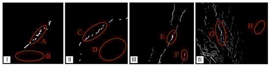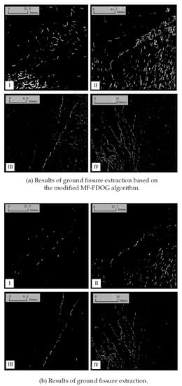 Finally, the post-processing procedure introduced in Section 3 was conducted, and the final results of ground fissure extraction were derived (Figure 18c I–IV). According to the original image, the ground fissures in Figure 18a I do not satisfy the characteristics of a linear distribution due to their complex and broken shape. Therefore, only a small fraction of ground fissures with a discrete distribution were extracted. After applying the RF algorithm, many error targets caused by shadows remain in the lower right corner of Figure 18b II, along with correct ground fissures. In comparison, Figure 18b III,IV clearly shows the distribution and shape of ground fissures. In order to better demonstrate the effect of the modified MF-FDOG algorithm, the results of ground fissure extraction are superposed on the original experimental image in Figure 18c.