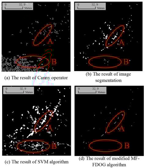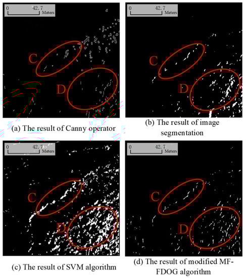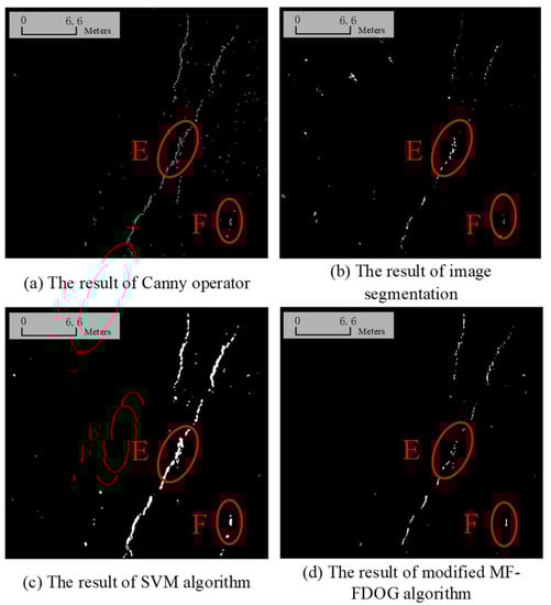 Ground fissures can be extracted by the Canny algorithm in the form of edges, which cannot be compared with the SVM algorithm, grayscale threshold algorithm, or modified MF-FDOG algorithm. Therefore, we compared and analyzed the latter three algorithms. The overall accuracy [] is calculated using Equation (15), and results are shown in Table 6: