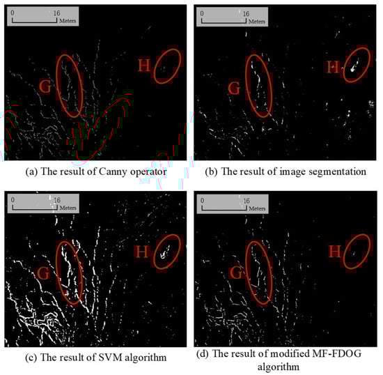 To evaluate the effectiveness and accuracy of the modified MF-FDOG algorithm used in ground fissure extraction based on UAV images in a loess area, expert images (Figure 20) of ground fissures were obtained by visual interpretation according to surveys and previous experience. These expert images have sufficient precision for use as reference images. Furthermore, three other traditional algorithms (e.g., Canny operator, image segmentation, and SVM (support vector machine) algorithm) were used to extract ground fissures. The results of these algorithms are shown in Figure 21, Figure 22, Figure 23 and Figure 24, in which (a), (b), (c) and (d) represent the results of the Canny operator, image segmentation, and the SVM algorithm, respectively. The accuracy of the shapes marked A–H was analyzed in this study.