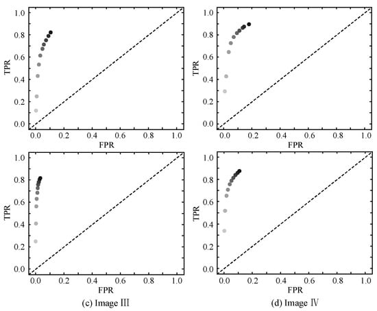 Here, TN and FN denote the correctly extracted pixel number and incorrectly extracted pixel number, respectively; represents the total pixel number of an image; and represents the pixel number of the expert maps derived by visual interpretation. The range of TPR and FPR is [0, 1].