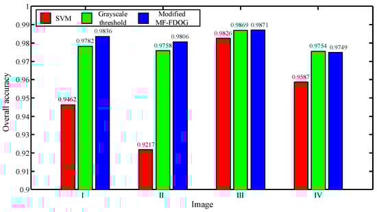where denotes the overall accuracy and denotes the number of correctly extracted background pixels. As shown by the results (Table 6 and Figure 26), the modified MF-FDOG algorithm is better than both the SVM algorithm and the grayscale threshold segmentation algorithm.