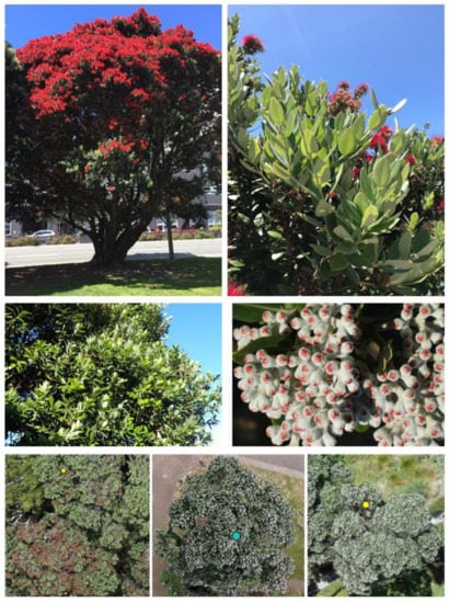 Images of pōhutukawa trees illustrating the distinctive features such as multi-stem form, leaf colour and texture and extensive buds and flowers usually present in summer. The bottom row shows aerial views from very high-resolution UAV imagery.