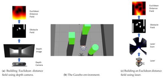 In this section, firstly, the strategy about how to build the obstacle field from the depth maps of the depth sensor is explained, and then the method for transforming the obstacle field to the Euclidean distance field is presented. As depth cameras and LIDAR sensors are widely used in the area of robot navigation, they are selected as examples to explain how to obtain the Euclidean distance field from the depth map. Figure 2a,c show a diagram with the steps to build an Euclidean distance field from a depth image and from a laser scan, respectively.