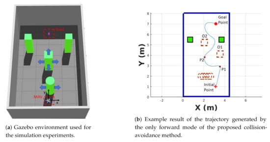 Figure 6a shows the simulation environment used to evaluate the proposed collision with different initial yaw angles. The value of the initial yaw angle is computed as . The initial point of this simulation is always (0 m, 0 m, 1.1 m). The goal point can be generated randomly between the two red boxes in Figure 6a. The size of the quadrilateral obstacle is 0.3 × 0.3 × 2 m, and the positions are shown in Figure 6b. The 95 success trails out of 100 trails of the proposed algorithm are shown in Figure 6b.