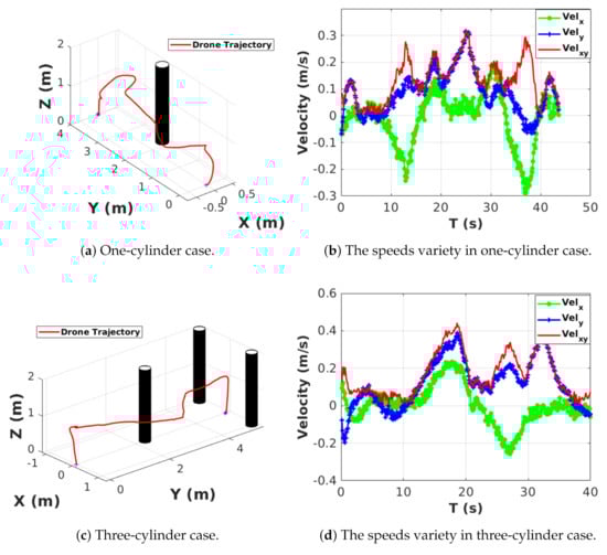 There are two different cases designed for real flight experiments. One is a one-cylinder case and the other is a three-cylinder case. The start points of these two scenarios are (0, 0, 0), while the endpoints of one cylinder and three cylinders’ environments are (0, 4, 0) and (0, 5, 0), respectively. The maximum velocities in the one cylinder and three cylinders cases are 0.32 m/s and 0.44 m/s. Figure 7a,c show the trajectories of these two experiments, while Figure 7b,d show how the velocities vary during the experiments.