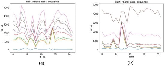 In fact, for any classification problem, as long as the time sequence is considered, it can be called time series classification. When performing land cover classification for a single pixel in time series remote sensing data, the process takes into account the data of each band of the pixel within a certain time range. We arbitrarily took Landsat8 time series remote sensing data for a period of time, and visualized the time series of some samples. By observing these time series (Figure 2), we can identify a big difference in the trend according to the time series of different samples. Through these differences, we can divide the types of land cover into forest land, water bodies, buildings, and other types.