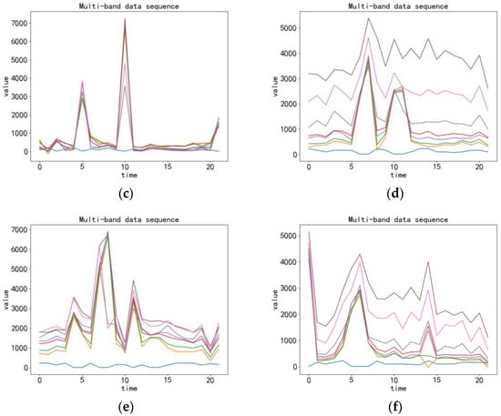 Multiband remote sensing time series visualization. (a) Sample one; (b) sample two; (c) sample three; (d) sample four; (e) sample five; (f) sample six.