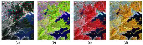 Display of different band combinations. (a) Red–green–blue; (b) swir1–nir–blue; (c) nir–red–green; (d) nir–swir1–red.