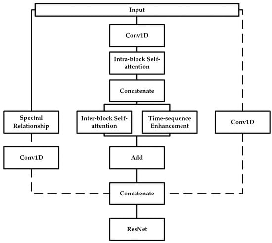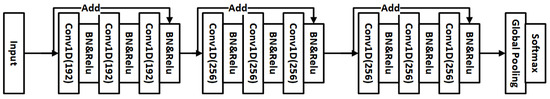 After extracting all the features and fusing them, we input the fused features into a ResNet network. The method of feature fusion involves summing the local features extracted from the self-attention method within every subsequence, the global features extracted from the self-attention mechanism among the subsequences, and the time series enhancement features. Additionally, we then splice the addition results, the spectral sequence relationship features, and the original features to derive the final fusion feature. It should be noted that we only used the idea [46] of residuals, and did not use a very deep network structure. A similar structure is used in our model to the ResNet mentioned in Fawaz, H.I., et al. [6]. Figure 11 shows the structure of the simplified ResNet.