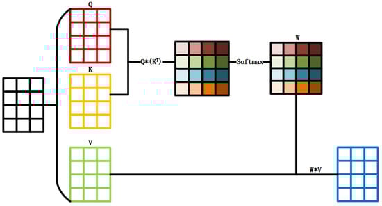 The difference between the self-attention mechanism and the traditional attention mechanism is that the self-attention mechanism considers the interaction among the various elements within the sequence. The self-attention mechanism mainly includes three parts: A. Calculate the query vector, key vector, and value vector for each time step; B. Calculate the weight matrix; C. Calculate the weight sum [43,44]. Figure 8 shows the structure of the self-attention mechanism.