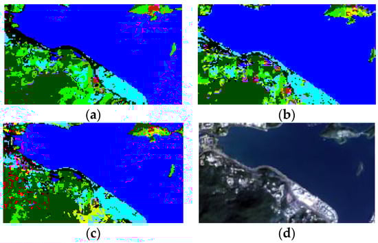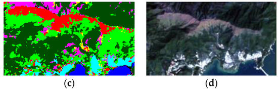 Different combinations of bands indicate obvious differences among the land types. The true color image was synthesized from three bands of red, green, and blue (as shown in Figure 5a). The image obtained by this combination is more close to the true color of the ground object, so we could determine different ground object types more intuitively, but the image was dull and the hue was gray. The composite image of swir1, nir, and blue (Figure 5b) shows a variety of vegetation types, which facilitated vegetation classification. The standard false color image (as shown in Figure 5c), synthesized from nir, red, and green bands, shows ground objects in bright colors, which was conducive to vegetation (red) classification and water body recognition. The nonstandard false color image (as shown in Figure 5d) was synthesized from nir, swir1, and red. This image has a clear water boundary, which has been conducive to the identification of coast and gives a better display of vegetation, but it is not convenient for distinguishing specific vegetation types.