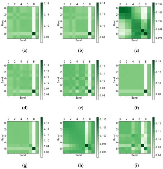 Although there are similarities in the spectral relationship distribution diagrams, we can see some differences in their inter-block influence matrix distribution diagrams. For example, there are differences in the distribution maps of urban areas and other built-up surfaces. In the distribution map of urban areas, the area (13–18, 13–18) is brightly colored, which means that the mutual influence is greater; in the distribution map of other built-up surfaces, in (6–7, 0–18) and (12–13, 0–18), two areas show two obvious dark bands. Although there are dark bands in the distribution maps of forests and grassland at (7, 0–18), there are obvious dark areas in the distribution maps of forests at (12–15, 0–11). However, this dark area does not exist in the distribution map of grassland.