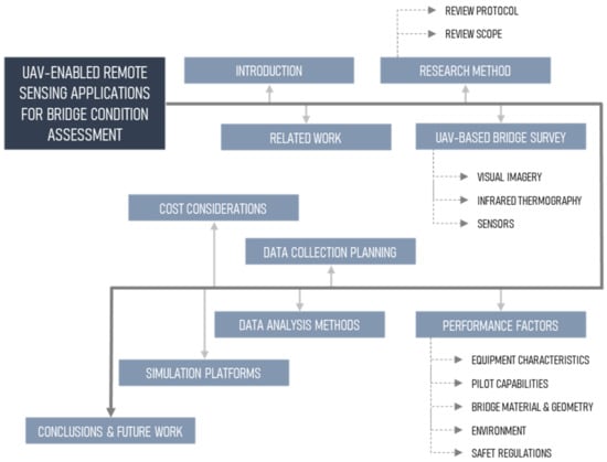 Existing literature have analyzed the general aspects of UAV applications associated with construction industry and built environment [,,]. Recent research have also focused on analysis algorithms based on data collected using UAVs []. To the author’s knowledge, the existing literature lacks a specialized review that considers all aspects of integrating remote sensing techniques and the associated hardware on-board UAVs that can potentially be used for bridge condition assessment, including data collection and processing methods, cost facets, UAV performance factors, and software platforms. Hence, this review paper is intended to address the paradigm shift in bridge inspection and condition monitoring arising from the utilization of UAV-based remote sensing. This study aims to address key research aspects including UAV-based non-destructive inspection, data acquisition methods, data processing techniques, cost considerations, UAV performance factors and simulation platforms. This endeavor is a continuation of previous research work and compliments the review conducted with regards to bridge inspection using non-contact testing (NCT) technologies []. The structure of this article shown in Figure 1 includes the following main elements: first, an introduction of previous work followed by the research methodology. The methodology highlights the review scope and protocol and presents details of studies’ selection criteria and quality assurance. Secondly, an in-depth critical analysis of the application of UAV-based non-destructive bridge monitoring is conducted. Numerous non-destructive testing (NDT) techniques, including infrared thermography (IRT), Light Detection and Ranging (LiDAR) technology, visual imaging (VI), and other sensors used in confluence with drones are discussed. These include the analysis of stand-alone as well as integrated NDT-UAV systems. Subsequently, data acquisition, processing and the software platforms utilized are summarized, followed by the analysis of factors affecting UAV performance. Finally, the paper concludes with challenges and limitations facing the application of UAV-based methods for bridge condition monitoring, as well as future recommendations for research and development.