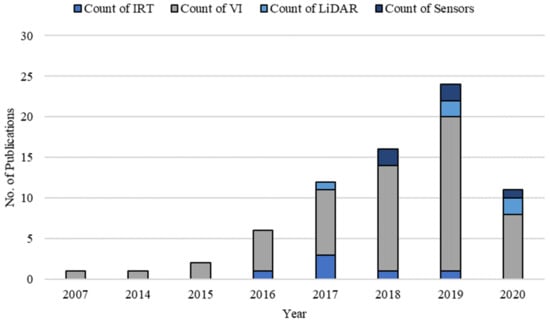 The present review focuses on identifying the current state of literature in non-destructive bridge inspection and monitoring using UAV systems, and addresses a recommended future expansion of previous work that explored terrestrial non-contact technologies []. This study explores non-destructive technologies (NDTs) that can be mounted on UAVs for bridge monitoring and data collection including infrared systems, VI devices, LiDAR, and other sensors. Sixty-five conference and journal articles published worldwide, during the study period of 2000 to 2020, were analyzed. Figure 2 illustrates the distribution of the compiled NDT-based UAV studies over the course of the study period. Evidently, interest in this domain of research has been increasing recently; 80% of the reviewed studies were conducted in the past three years.